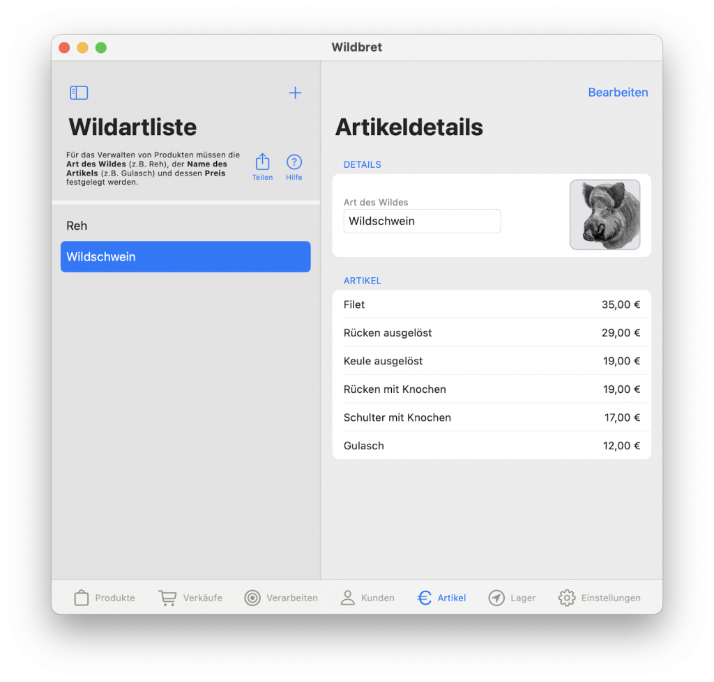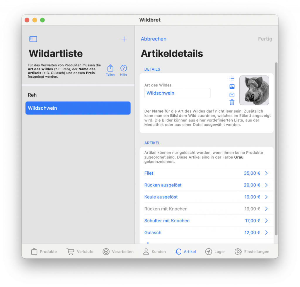 Die Details zur Wildart und die Artikel können bearbeitet werden. Neben dem Namen und dem Bild der Wildart können auch der Name und der Kilopreis der Artikel geändert werden. Das Löschen von Artikeln ist nur möglich, wenn der betroffene Artikel nicht in den Produkten verwendet wird. Artikel, die gelöscht werden können, sind in der Farbe GRAU gekennzeichnet.