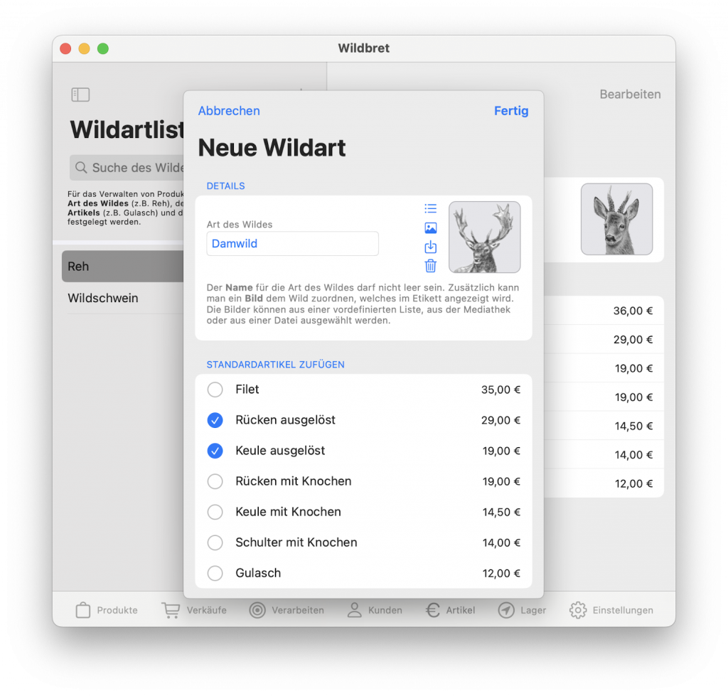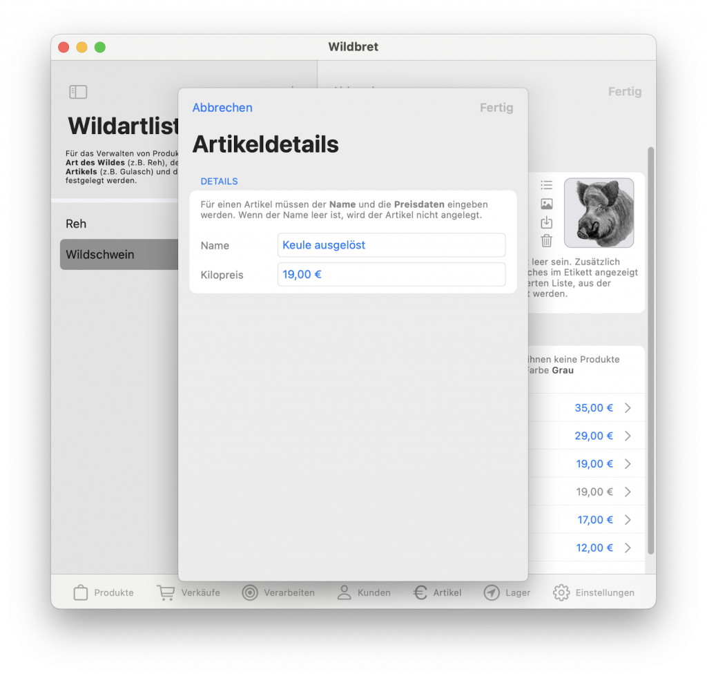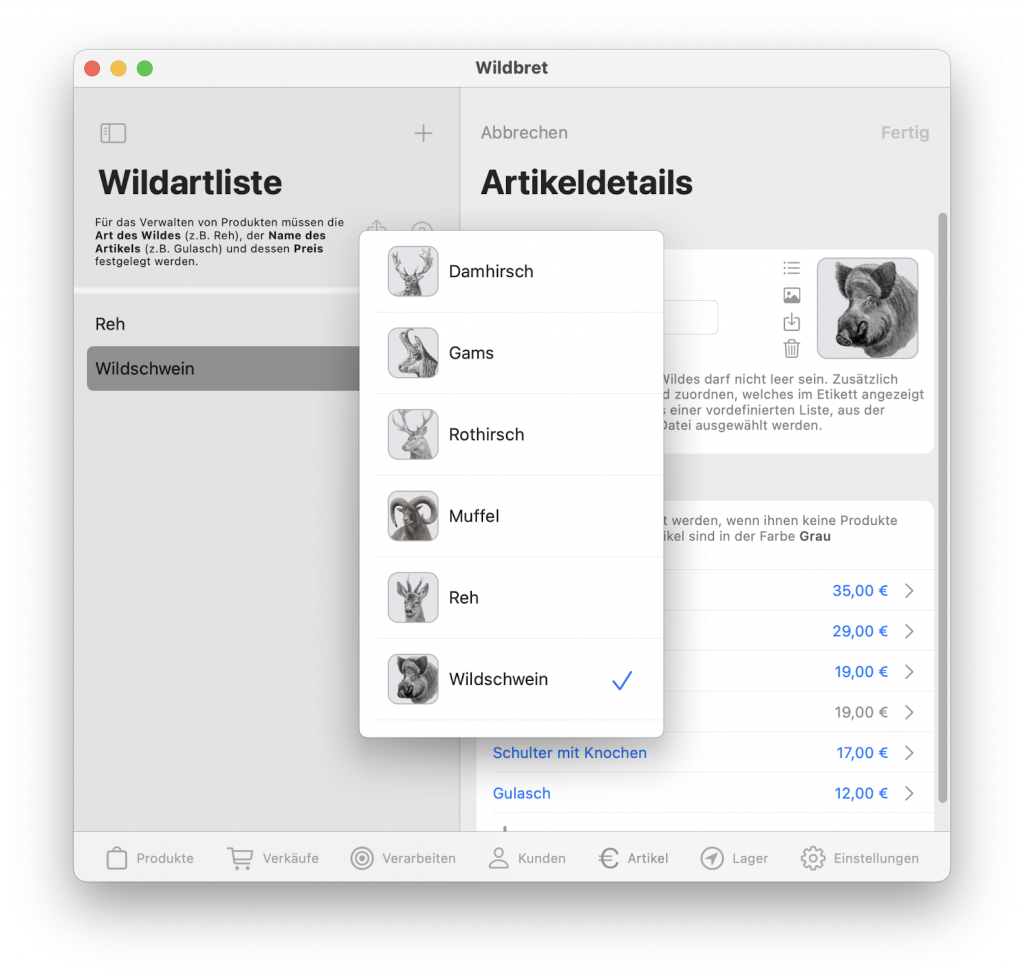 Die Wildartliste zeigt alle definierten Wildarten an. Die Artikeldetails zeigen die Art des Wildes und ein Bild für die Etiketten an. In der Liste werden alle Artikel der Wildart sortiert nach dem Kilopreis angezeigt.
