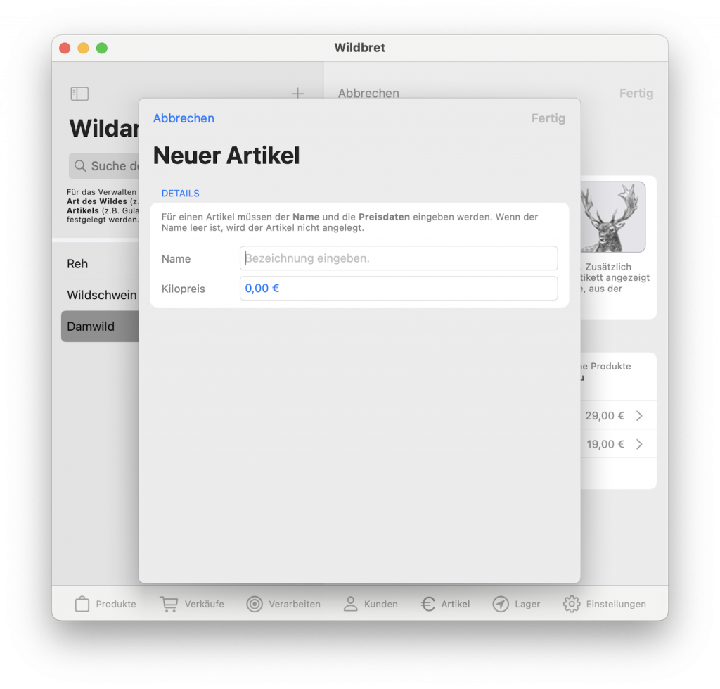 Über das PLUS-Zeichen oben rechts in der Wildartliste kann eine neue Wildart angelegt werden. Bei einer neue Wildart muss der Name für die Art des Wildes zwingend festgelegt werden. Wahlweise können der neuen Wildart gleich noch Artikel aus einer vordefinierten Liste zugefügt werden. Der Name des Artikels und der Kilopreis sollten überprüft und nach dem Einfügen gegebenenfalls bearbeitet werden.